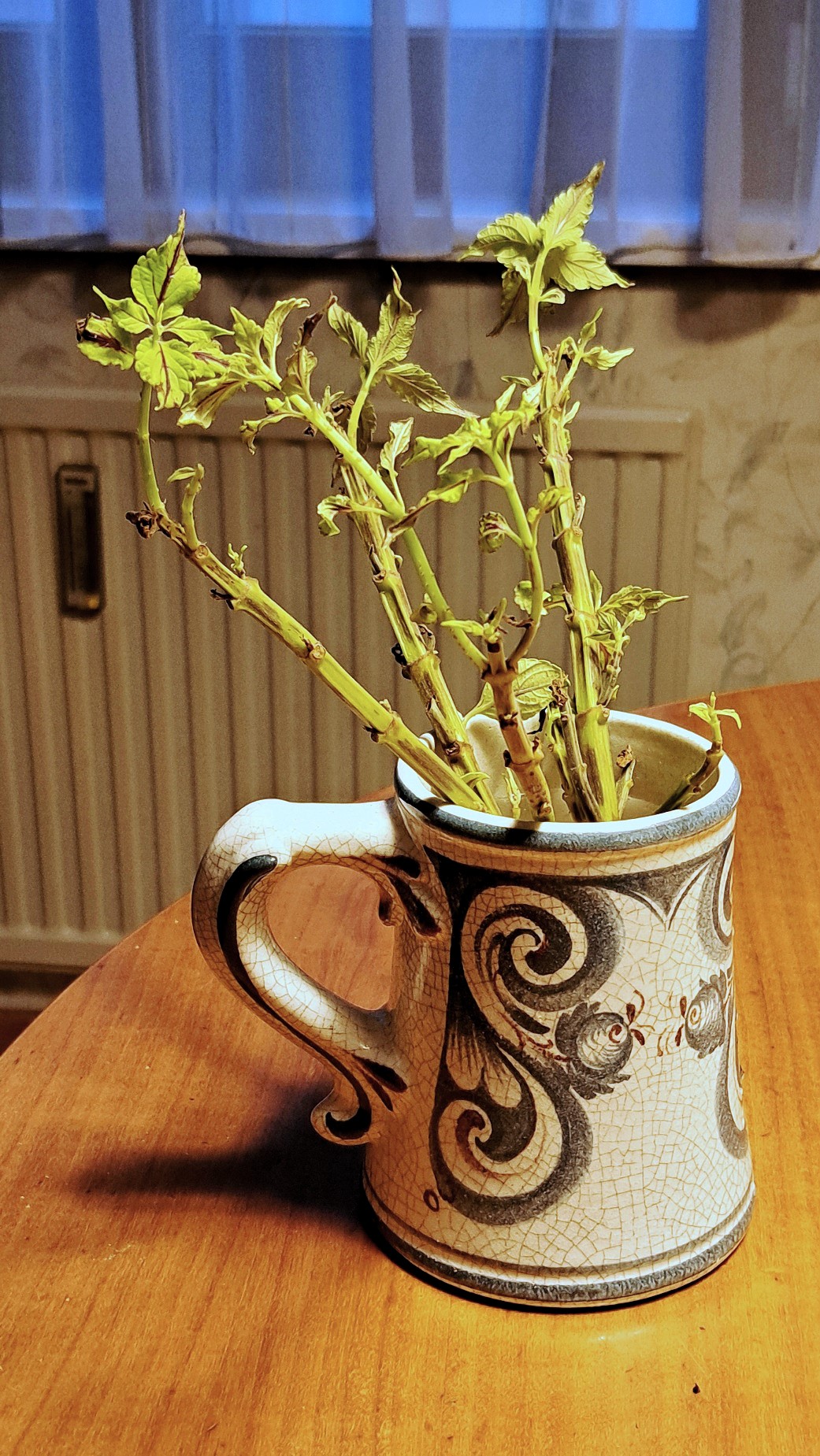 Noch vor unserem Mauritius-Urlaub stellte ich die Stecklinge in einen Bierkrug und schärfte meiner Tochter ein, das Gefäß ja nicht austrocknen zu lassen. Als ich heimkam, waren die Blätter trotz ausreichend Wasser im Krug samt und sonders dürr, lediglich die Stängel schimmerten noch grün. Wurzeln hatten sich keine gebildet. Wäre vielleicht ein durchsichtiger Glaskrug besser gewesen? Da eine Pflanze bei mir schon dreimal tot sein muss, um mich von ihrem Ableben zu überzeugen, füllte ich frisches Wasser nach und übte mich in Geduld. Siehe da, es treiben kleine Blättchen an den Spitzen aus! An zwei Stängeln habe ich sogar winzige Wurzelfäden gefunden! Wenn alles überlebt, kann ich nächstes Jahr sechs prächtige Buntnesseln im Garten verteilen. WENN, und von Pracht ist im Moment auch nicht viel zu sehen.