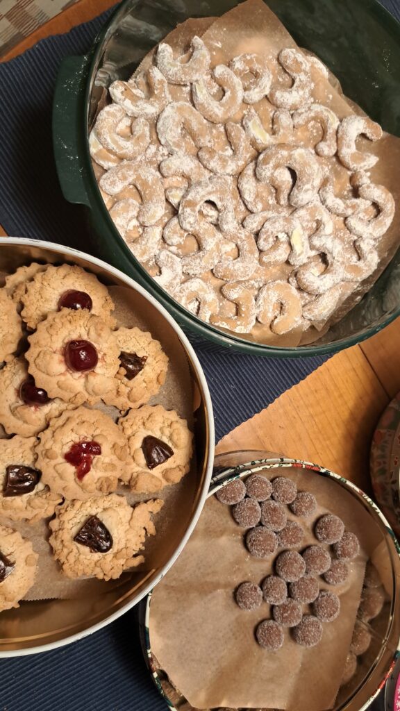 Dabei ist es alles andere als gelassen. Kekse backen, Wohnung schmücken, Geschenke besorgen, Freunde zum Punschtrinken treffen… jeden Tag ist was los. Nach einigen Jahren Pause habe ich mich heuer wieder auf die Weihnachtsbäckerei gestürzt. Da wir nächste Woche mit unseren Kindern und deren Freunden eine Punschjause ausgerufen haben, müssen wir nicht alles selber essen und ich kann in Rezepten schwelgen. Ich versuche mich zu erinnern, wie ich das vor zwanzig Jahren geschupft habe, 40-Stunden-Woche, zwei kleine Kinder und abends schnell zwei, drei Sorten Kekse in den Ofen schieben (oder langsam, wenn die Kinder unbedingt helfen wollten). Jetzt habe ich zwar den ganzen Tag Zeit, aber mehr als einen Teig schaffe ich nicht auf einmal. Trotzdem, die Dosen füllen sich. Und wir sind heilfroh, dass wir unsere ursprüngliche Idee, heuer eine Neuauflage unseres legendären Adventfestes im Garten (siehe „Das Gartenfest„) zu veranstalten, wegen der überbordenden Logistik gleich wieder aufgegeben haben.