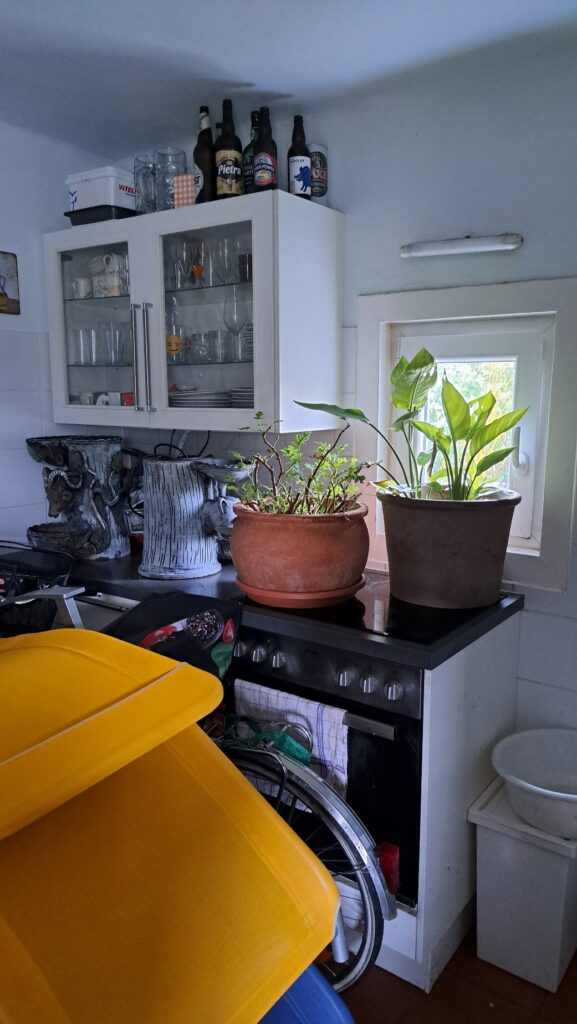 Ich kann nämlich nicht einfach alle Töpfe ins Haus stellen und fertig. Mein Fahrrad, die Liegen, die Tische, die Sessel, das Fass, die Griller, das muss alles vorher verstaut werden. Die Holz-Terrassenfliesen vom Liegeplatz, Sitzplatz unter der Blutpflaume und unter dem Bankerl kommen in der kalten Jahreszeit auf den Dachboden. Ohnehin muss ich jedes Frühjahr ein paar morsche Fliesen ersetzen, aber so dehne ich die Haltbarkeit der meisten doch auf ein paar Saisonen mehr aus. Im Herbst klebt die feuchte Erde auf den Brettern, das heißt erst einmal schon ein paar Tage vorher mit der Spachtel die rund 60 Platten abschaben und zum Trocknen aufstellen, ehe sie über die steile Dachbodentreppe nach oben wandern. Auch die Gartendeko wird eingesammelt und landet in der Mansarde. Klingt alles kompliziert, anstrengend und zeitraubend? Ist es auch, trotz einer eingespielten, ausgeklügelten Logistik wie bei einer Großbaustelle.